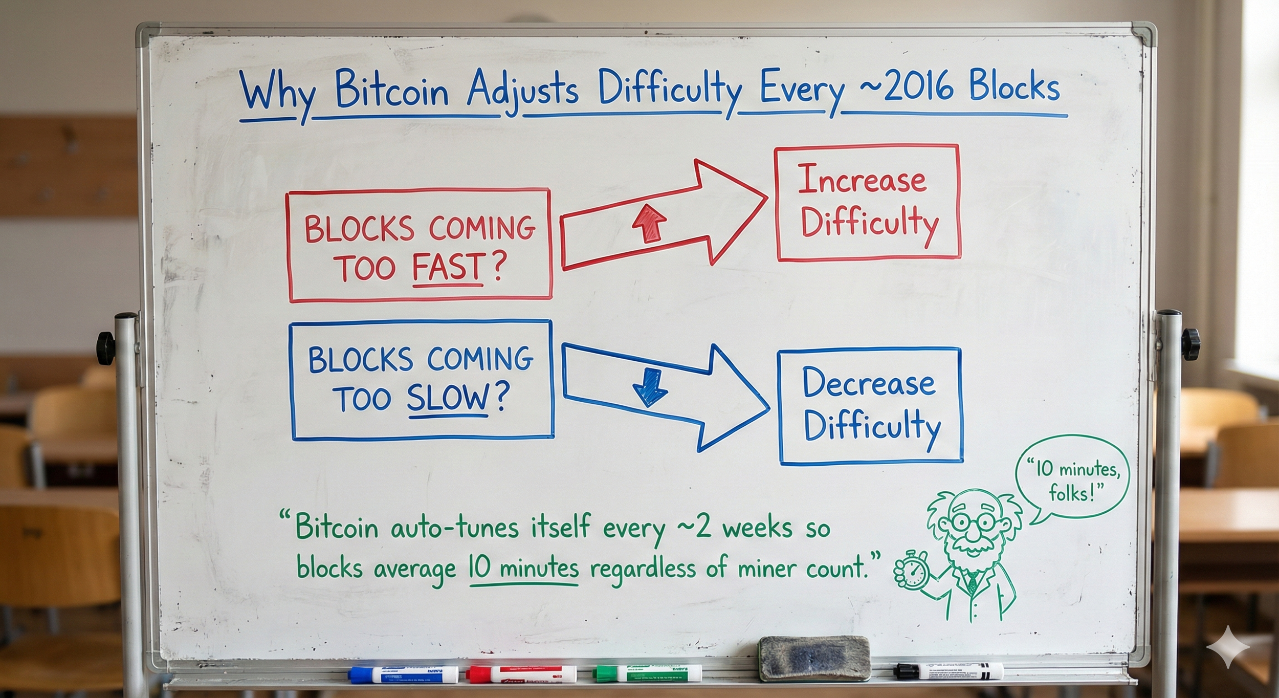 Every ~2016 blocks, Bitcoin runs a tiny feedback loop. It asks a simple question: “Are blocks arriving too fast or too slow?”